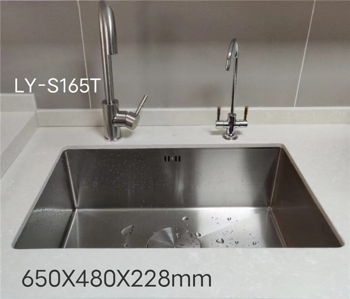 LY-S165T抗菌手工水槽。 外形尺寸650X480X228(mm)。 台上盆开孔尺寸620X450-4R10(mm)。台下开孔尺寸:598X378-4R15(mm)。 抗菌原理---不是所有的304#不锈钢金属材料都能抗菌的。而是金属材料中含有合理的抗菌金属元素的离子,如铜和银离子。含有合理抗菌金属元素特制的304#号不锈钢板.特殊的抗菌工艺处理后,铜和银离子自动不断的从金属表面析出,当细菌遇到金属表面析出的铜和银离子,会渗透到细胞膜,与酵素的HS基作用,阻耐生物电离子传达系统。损伤细菌的细胞膜。使细菌的蛋白质凝固。损害细菌的DNA和PNA,达到阻止细菌繁殖或消灭细菌的目的。对金黄色葡萄球菌和大肠杆菌,抗菌可达99.99%。LOINDA手工水槽确保水盆的刚性结构,面板采用3.5mm厚面板,侧板直立88度,。加厚面板有保证水龙头优质的稳定性。四个R角为10度,没有死角,四角清洗流畅方便。水槽底板制作四条快速排水导线,让水槽排水更顺畅。下水口后置,为水槽柜提供更大的储物空间。引领手工水槽行业高端制作标准。水槽背部采用小薄环保底胶,杜邦无味防潮涂层。起到静音防潮的作用。标配隆营达第六代下水管,下水口直径是140mm大口,具有排水快、集渣空间大等优点。封水平盖,不存污、易清洁。下水口到下水管底部仅205mm,具有体积小,出水管高等优点。50mm直径下水管具有不易堵塞,拆装容易、抗高温等特点。所有的洗菜盆长时间使用,底部很容易出现划痕,LY-S165T配上304不锈钢一体蓝洗锅,洗碗等餐具不在担心水槽底部划伤,又能洗菜沥水置物。