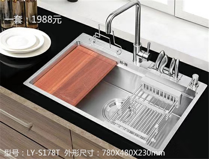 LY-S178T外形尺寸:780X480X220(mm)。 台上盆开孔尺寸:750X450-4R10(mm)。LOINDA手工水槽采用浦项304#不锈钢,确保水盆的刚性结构,面板采用3.5mm厚面板,侧板直立88度,有效的保证下面平面使用的大空间。加厚面板有保证水龙头优质的稳定性。四个R角为10度,没有死角,四角清洗流畅方便。水槽底板制作四条快速排水导线,让水槽排水更顺畅。下水口靠后设计,为水槽柜提供更大的储物空间。引领手工水槽行业高端制作标准。水槽背部采用小薄环保底胶,杜邦无味防潮涂层。起到静音防潮的作用。水槽标配隆营达第六代140口下水管,封水平盖,不存污、易清洁。每个接口都有硅胶圈,抗老化、密封严、下水口到管底仅205mm,非常节省橱柜空间。50mm直径下水管具有排水快,拆装容易、抗高温等优点!