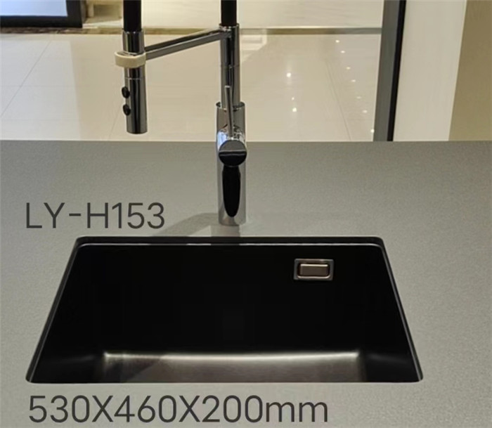 LY-H153花岗岩(石英石)水槽, 外形尺寸:530X460X210(mm)。台上盆开孔尺寸:505X435-4R10(mm)。台下盆开孔尺寸:468X398-4R12(mm)台下四角方盆。LOINDA达贝朗系列为花岗岩(石英石)水槽!采用进口石英石和pmma,8.5:1.5的黄金独特工艺,不但硬度超过莫氏七度,环保、密度极佳。当谈到寻找一种持久的、易于维护的厨房水槽花岗岩(石英石)水槽是非常好的选择。特别是他增加了厨房的魅力,更具有多种色彩的可供选择。并以橱柜风格相搭配,满足厨房色彩搭配的需求。在欧美花岗岩(石英石)水槽成为市场流行主要设计之一,他不仅美观、更经久耐用。不锈钢110mm直径提龙口!下水管采用pp材料,每个接口都有硅胶圈,抗老化、密封严、易拆装等特点。直径50mm下水管,透明防反味下水!稍有堵塞,很轻易被发现、抗高温等优点!